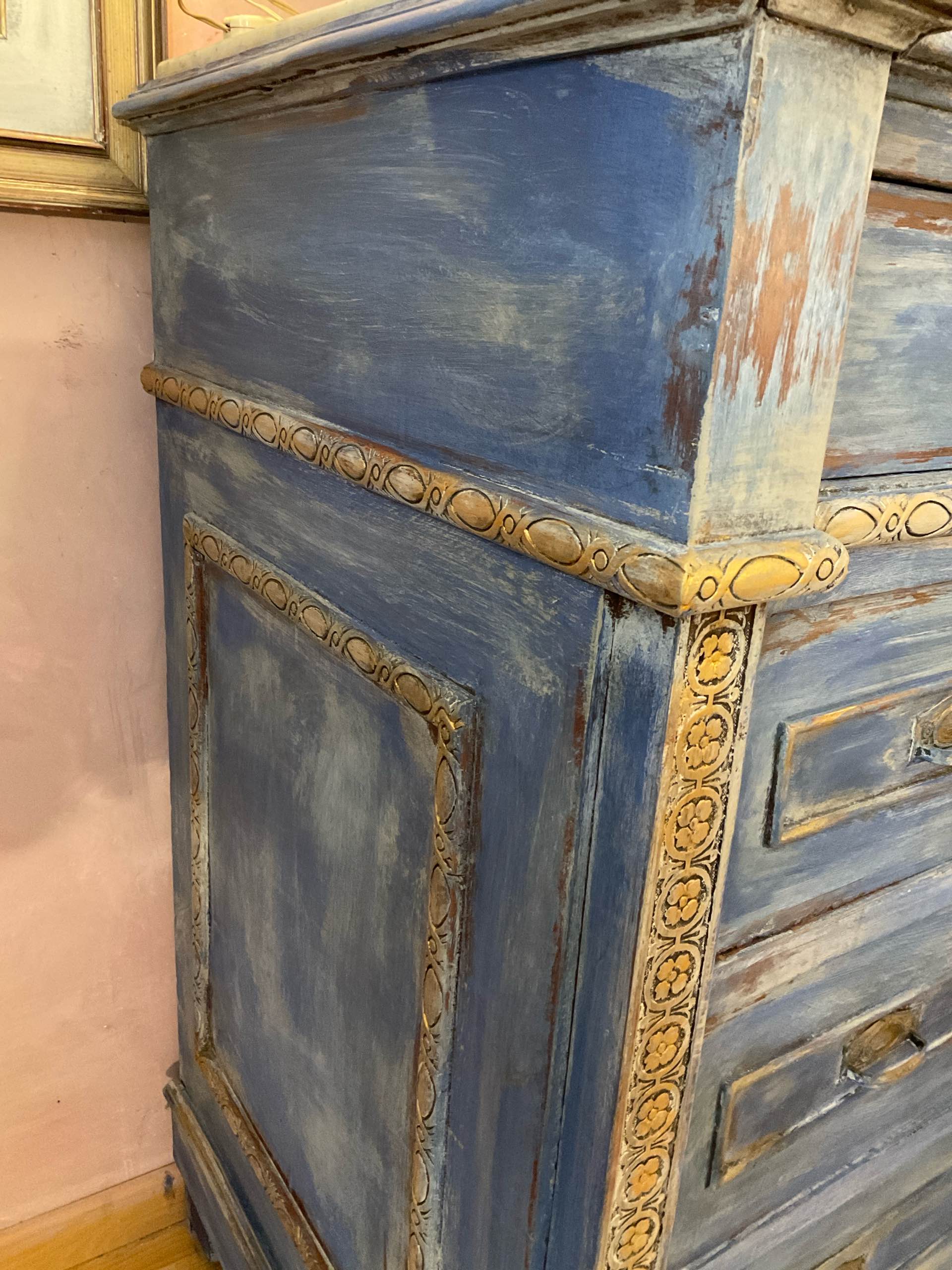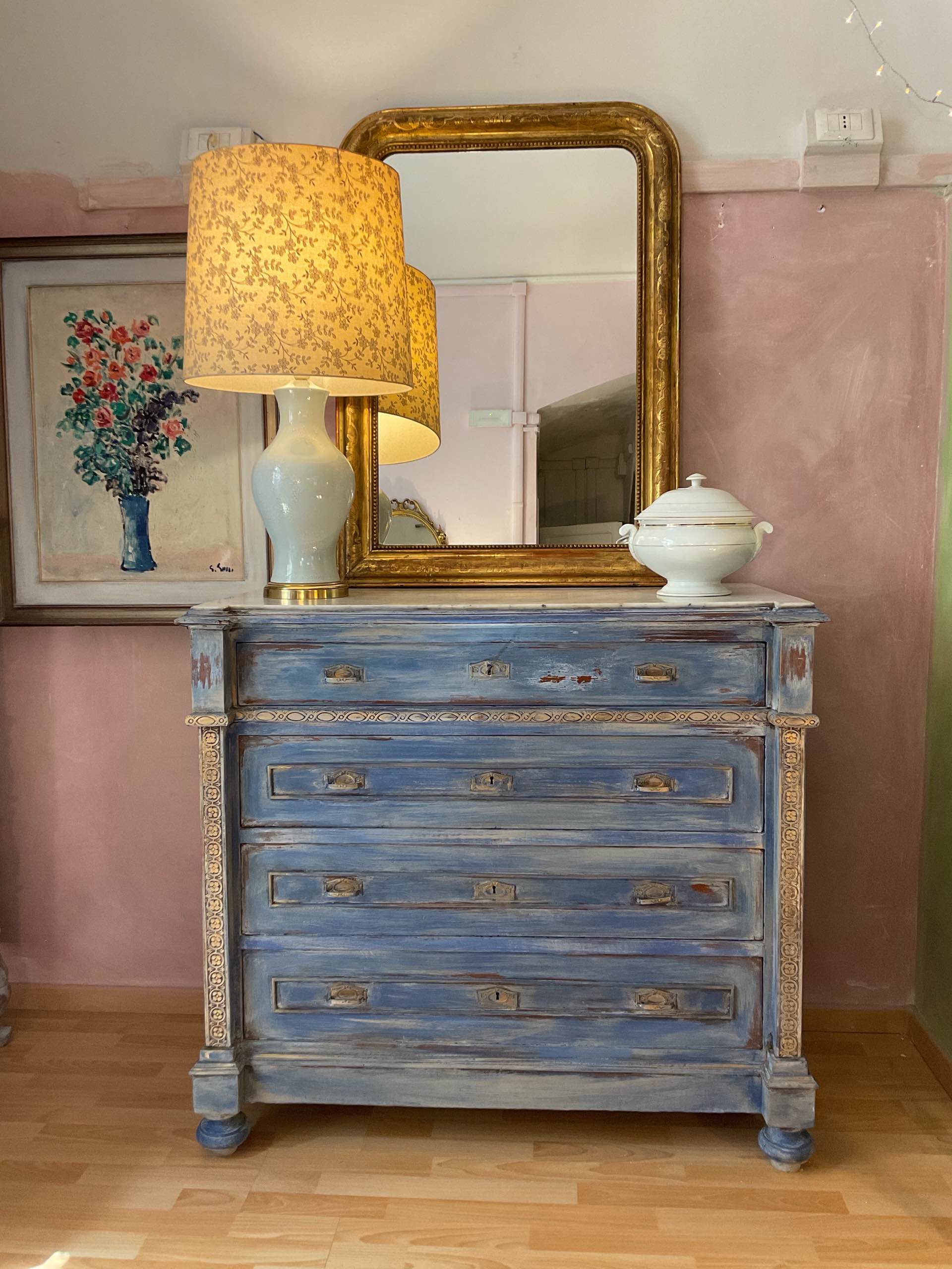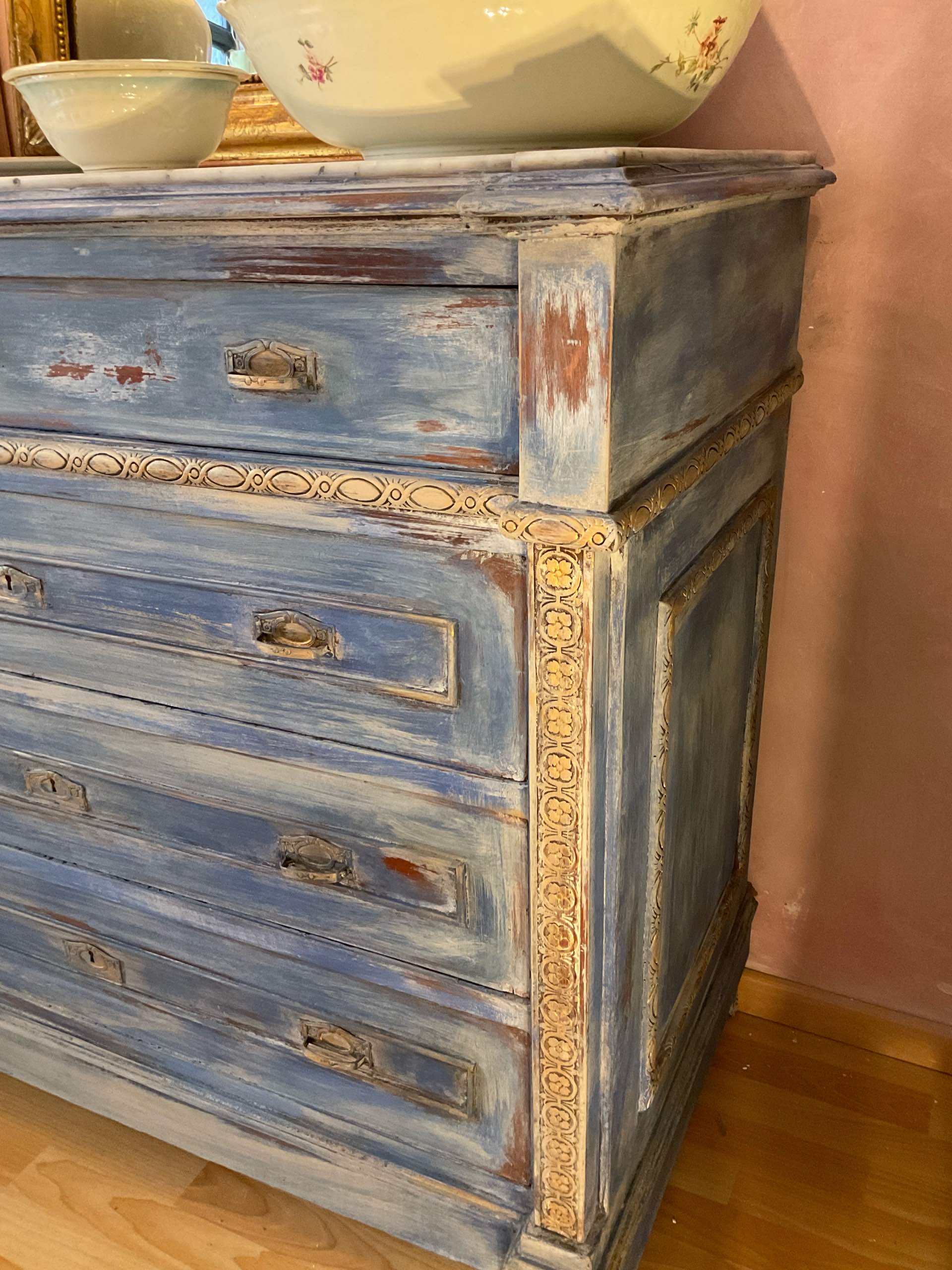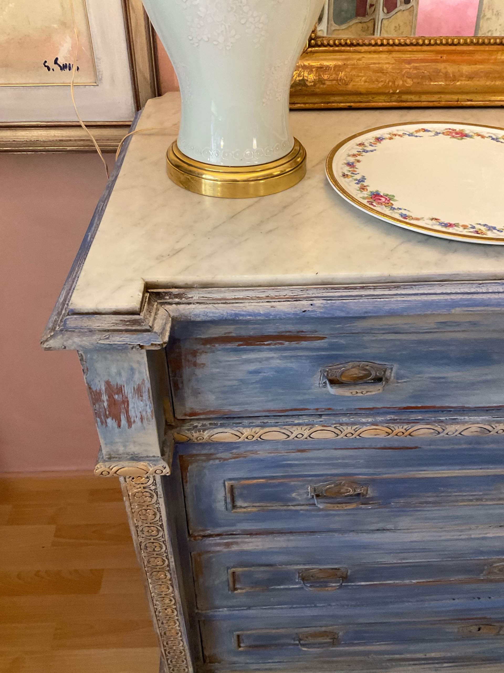 Comò di fine Ottocento dalle proporzioni generose, gusto elegante del tardo neoclassico con raffinati richiami allo stile Luigi XVI, linee simmetriche, modanature delicate e maniglie originali in bronzo. La patina grigia e azzurra con accenni in oro, ne esalta il fascino autentico. Il piano originale in marmo presenta una piccola sbeccatura sul retro, non visibile frontalmente, compatibile con l’età del mobile