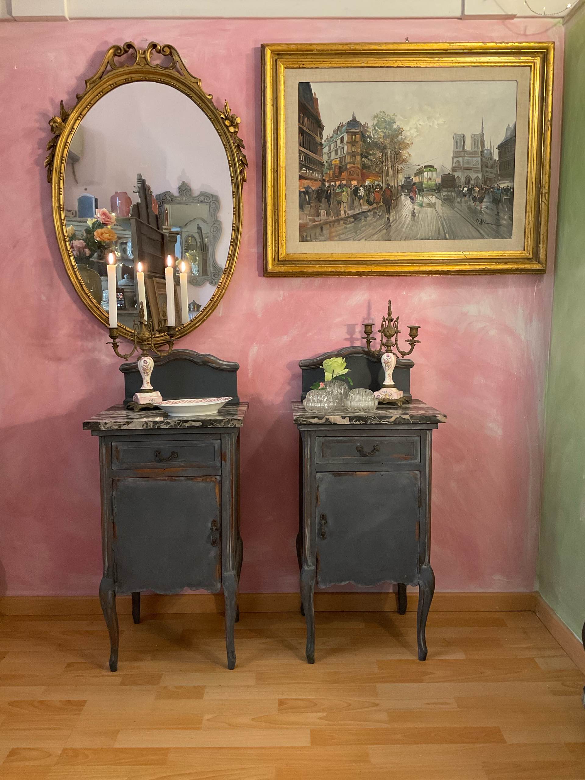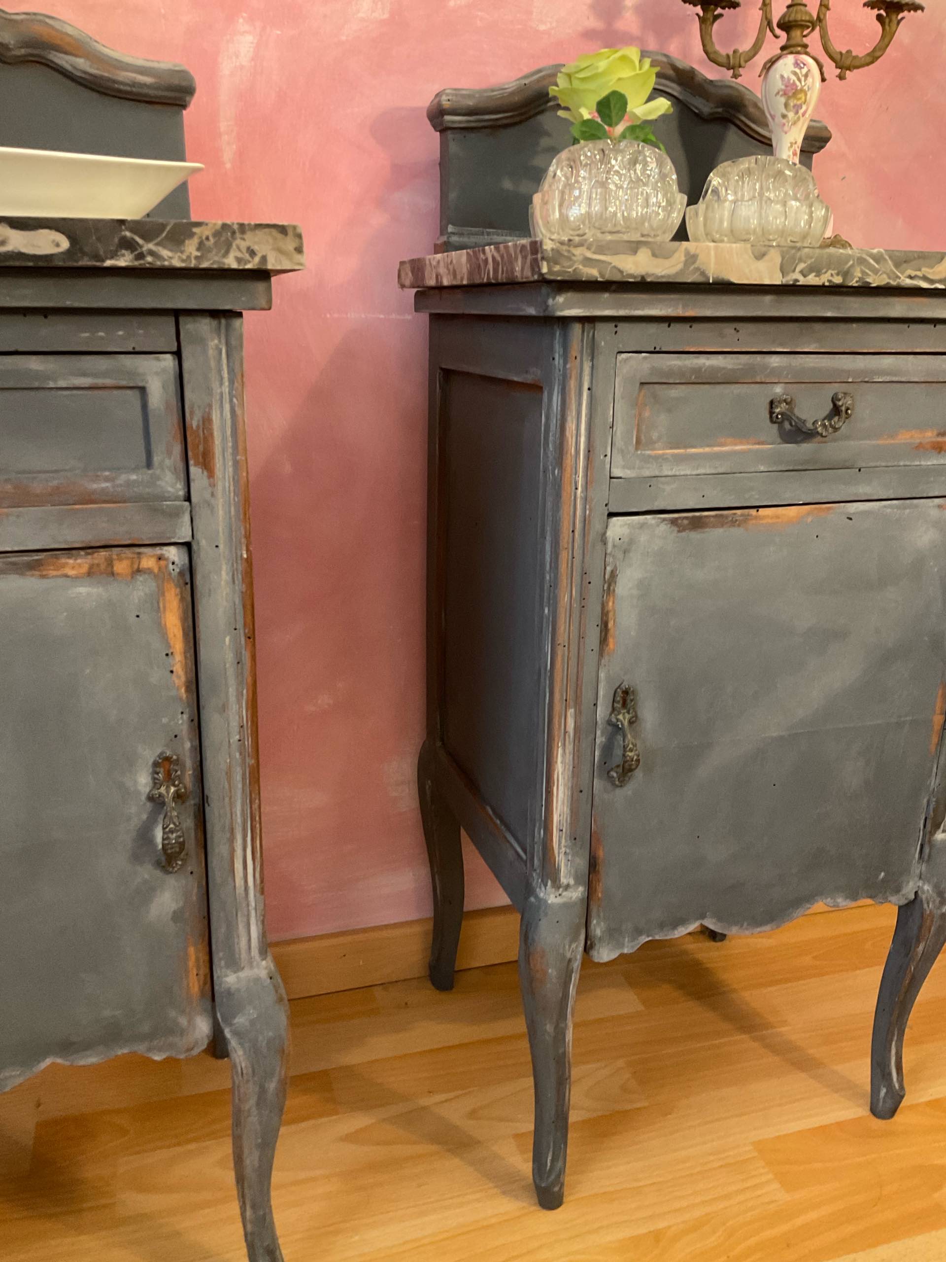 Coppia di comodini antichi con finitura profonda e vellutata, grigio fumo con leggere patine che lasciano affiorare il tempo e la materia. I piani in marmo nero con venature e sfumature più chiare. Le alzate (amovibili) hanno una forma arrotondata che addolciscono le linee dei mobili.