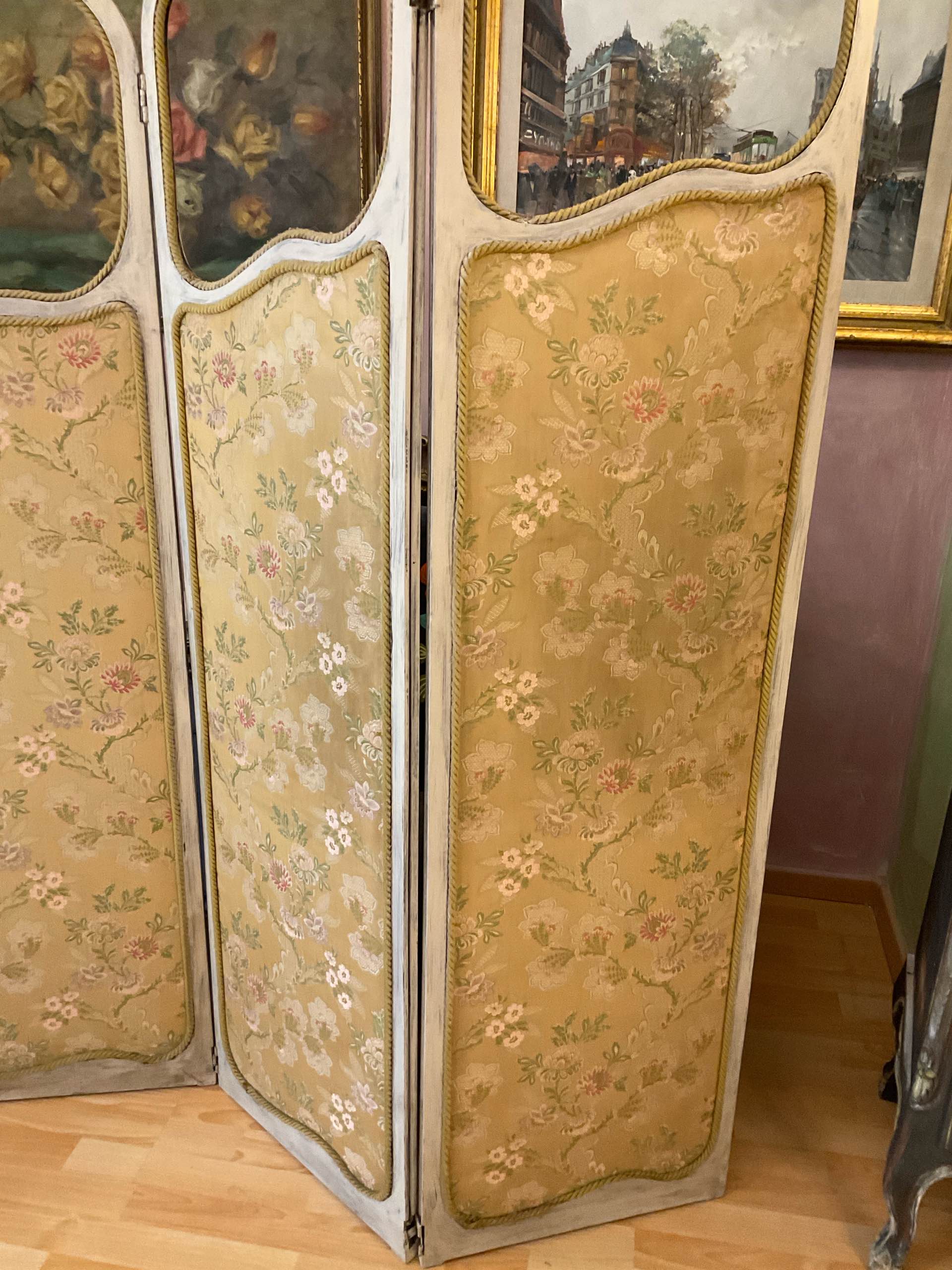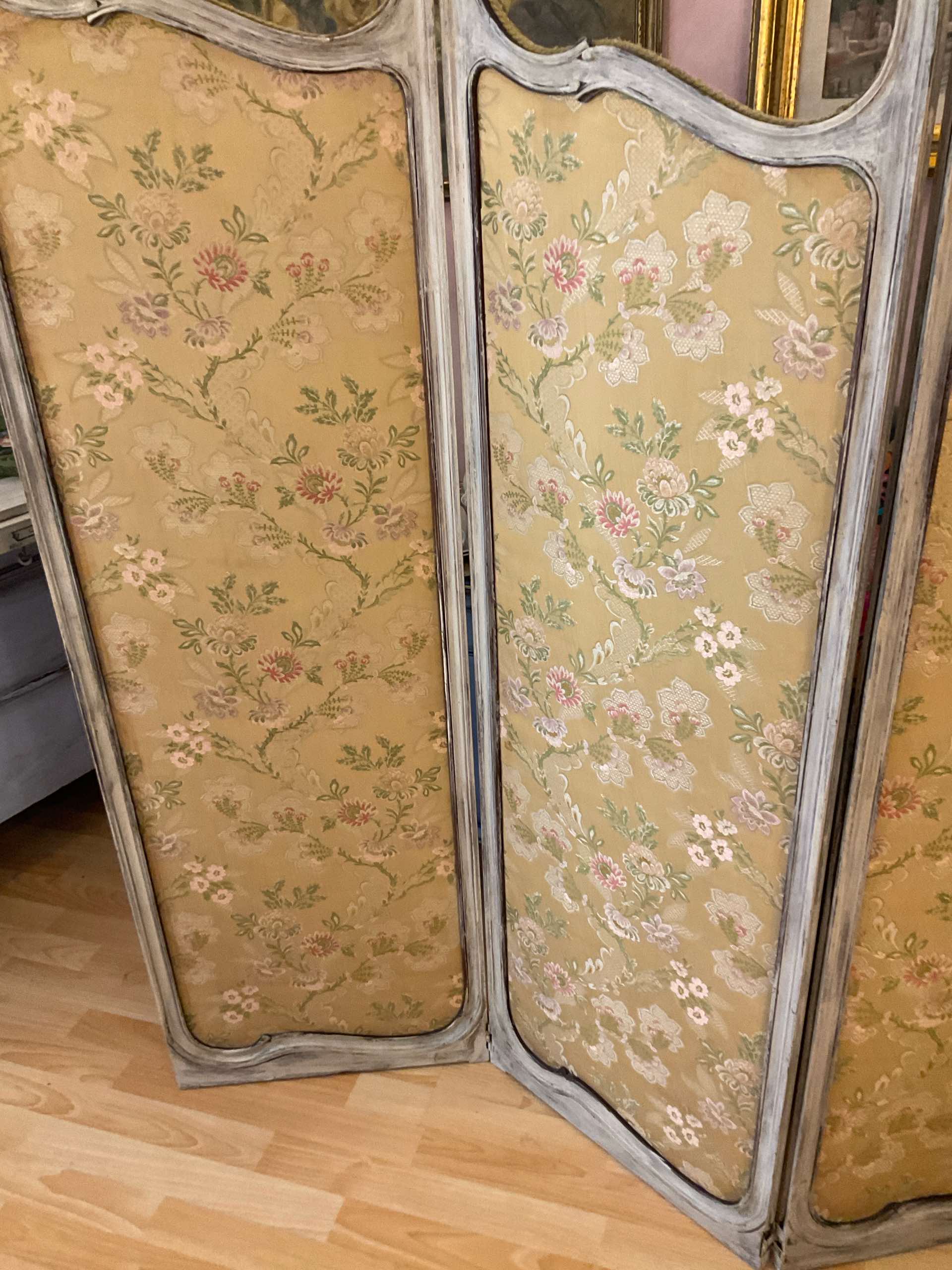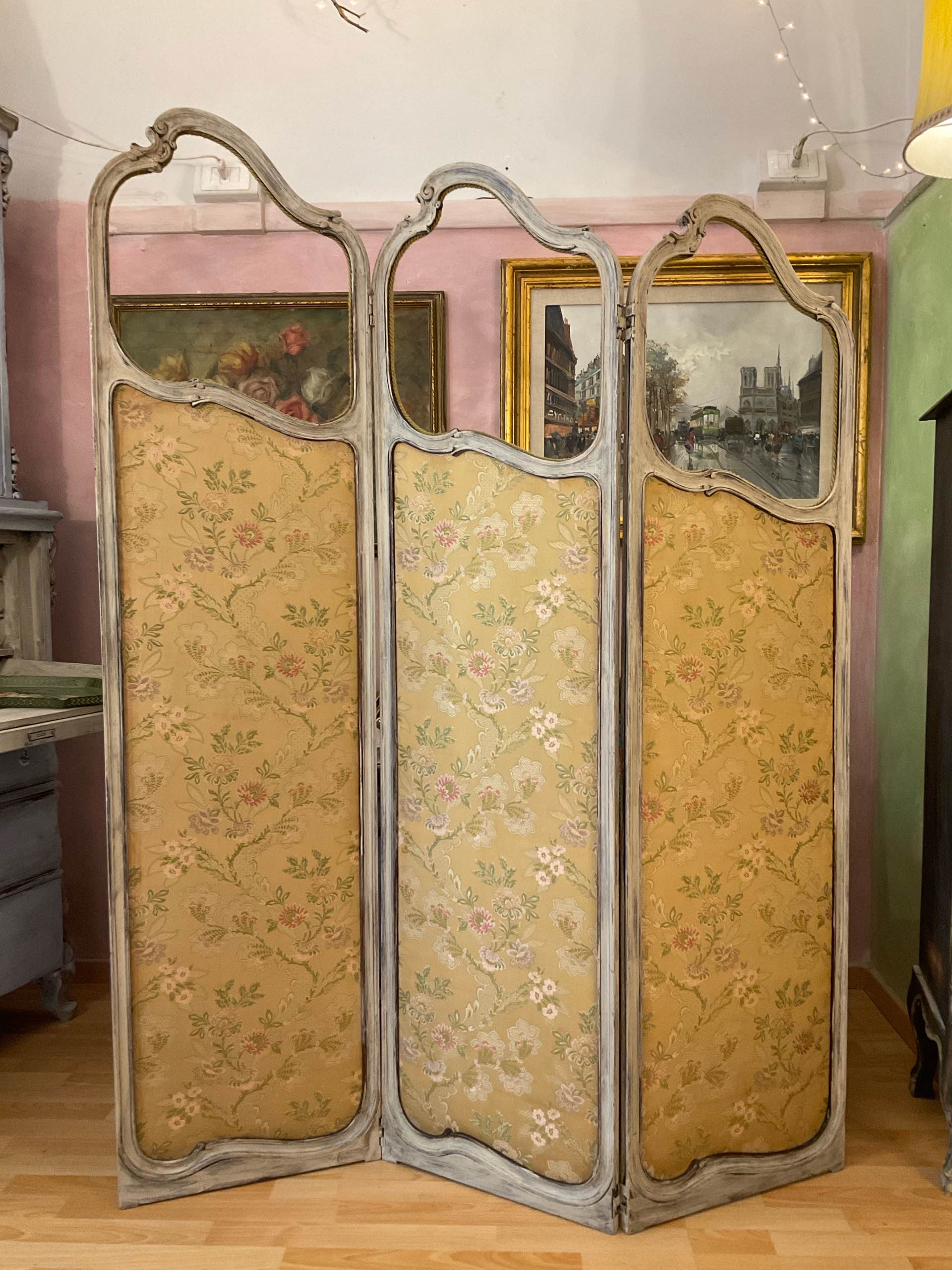 Elegante separé francese di fine Ottocento, a tre ante sagomate, con struttura lignea patinata e pannelli rivestiti in tessuto floreale. Un pezzo poetico e senza tempo, perfetto per creare angoli intimi e pieni di charme.