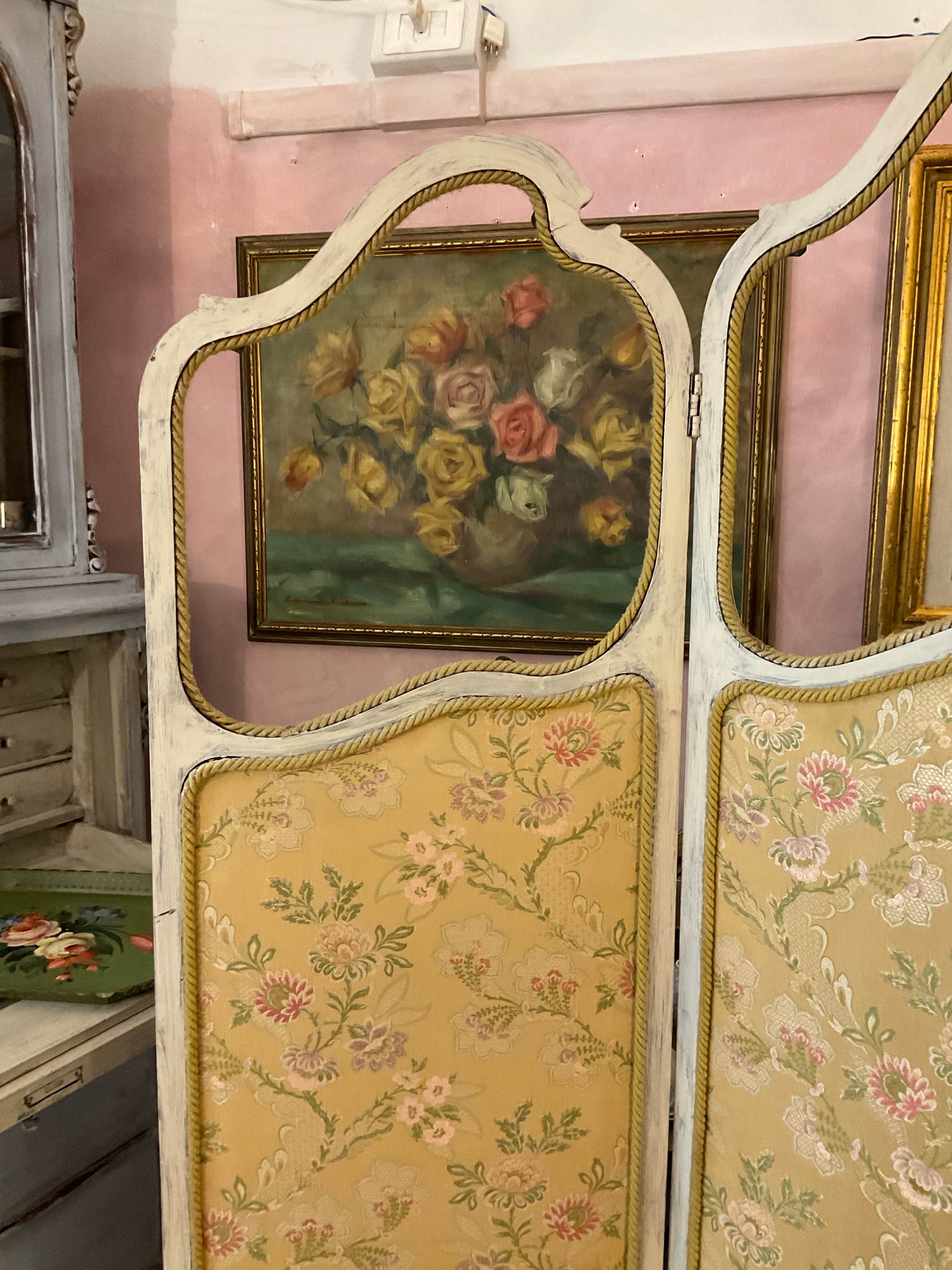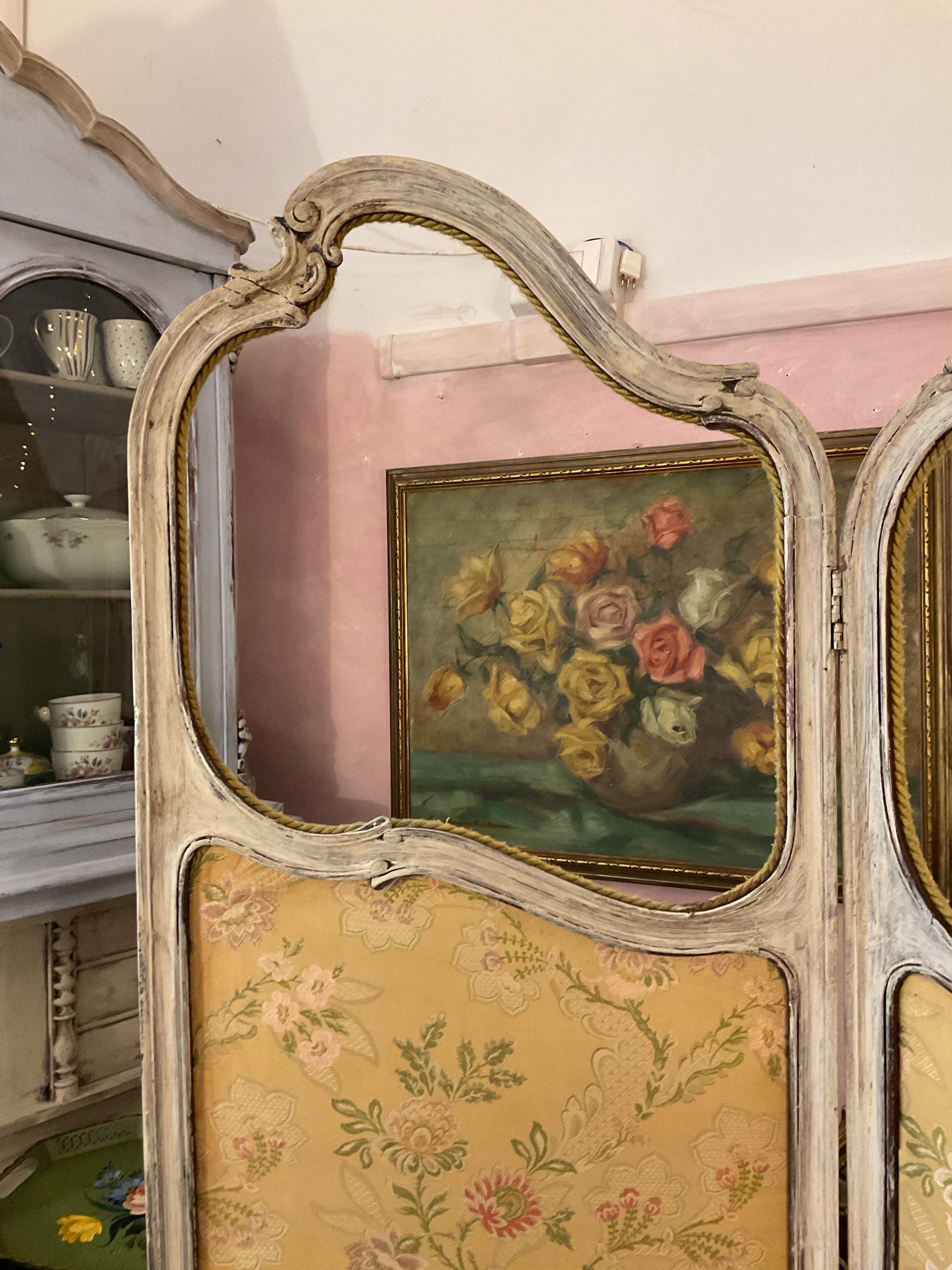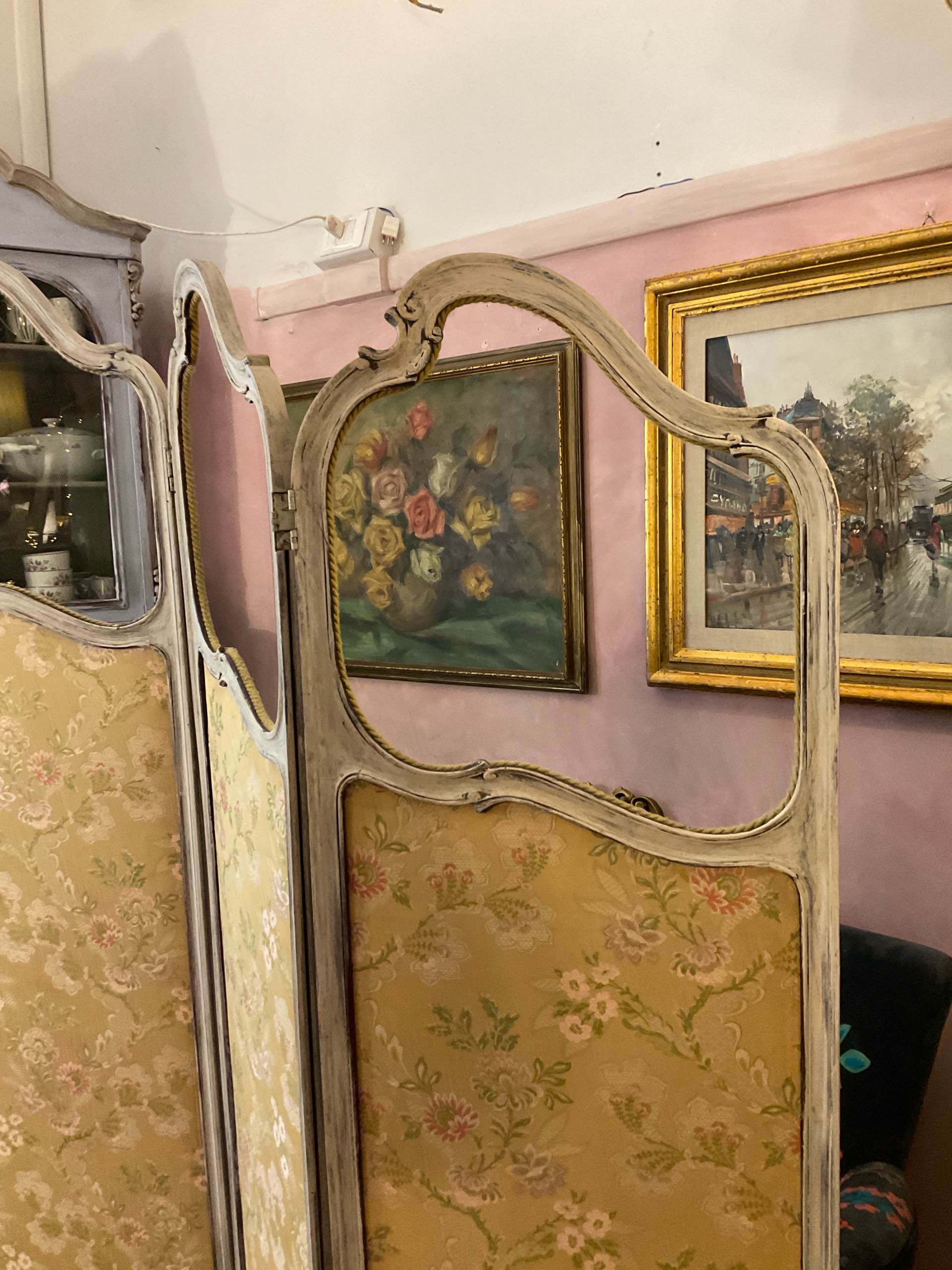 Elegante separé francese di fine Ottocento, a tre ante sagomate, con struttura lignea patinata e pannelli rivestiti in tessuto floreale. Un pezzo poetico e senza tempo, perfetto per creare angoli intimi e pieni di charme.