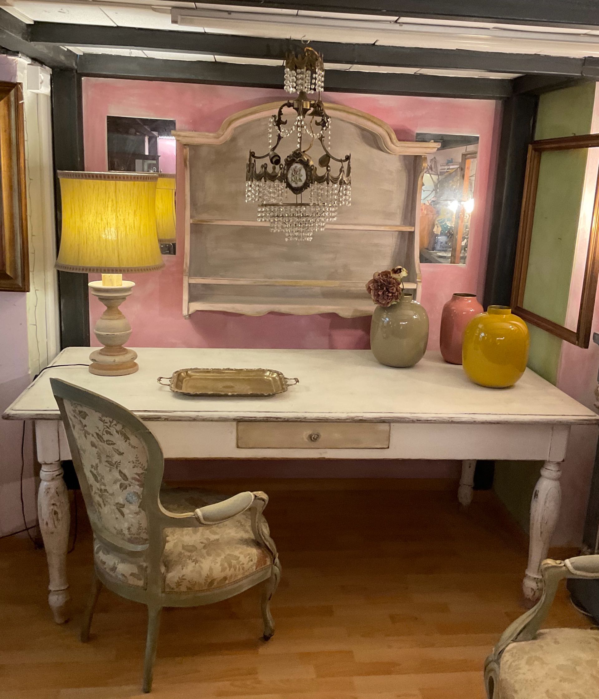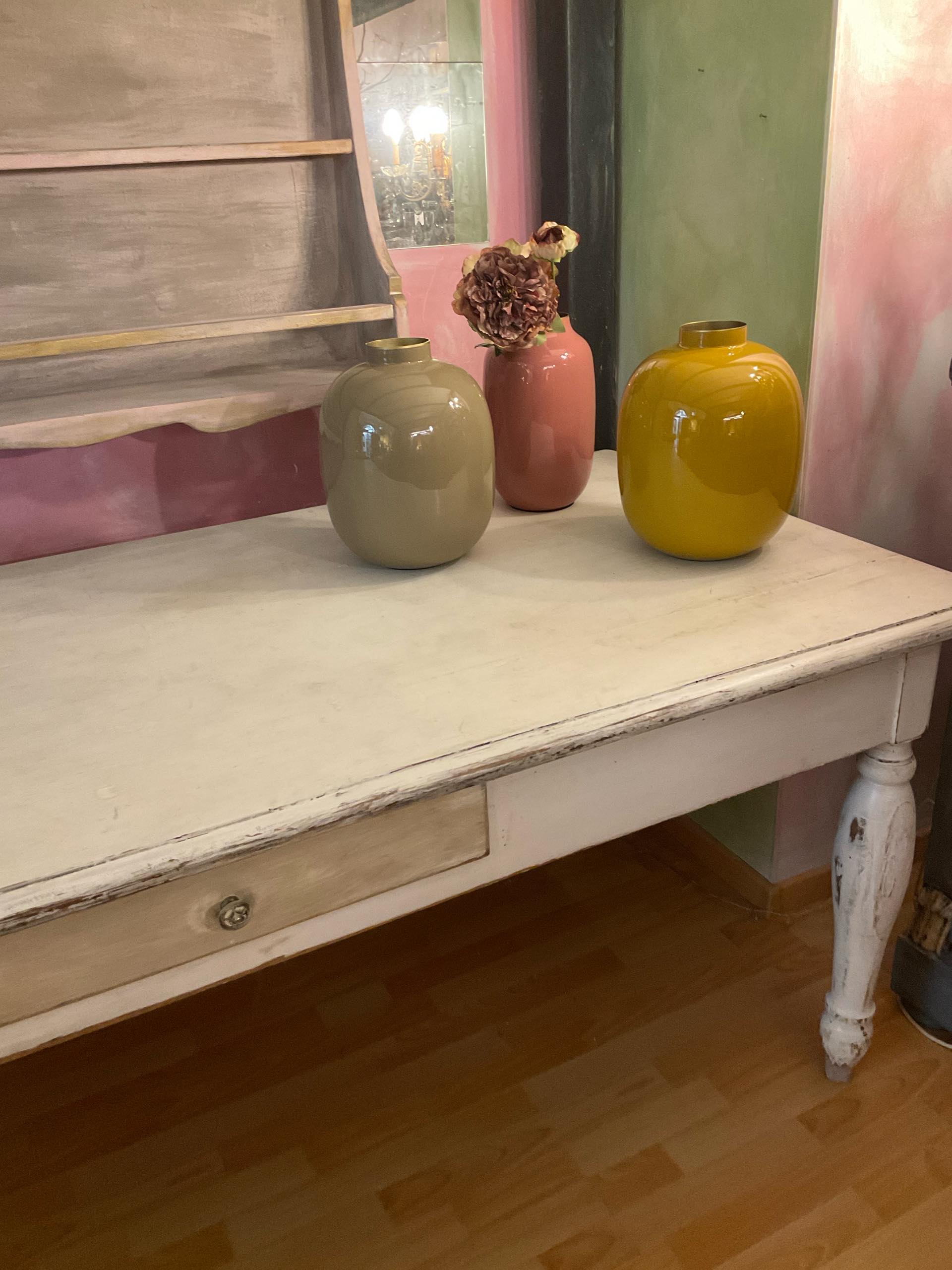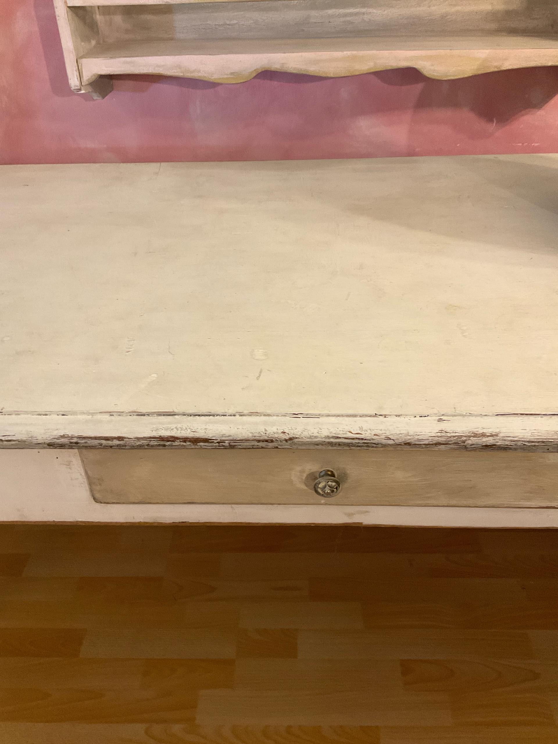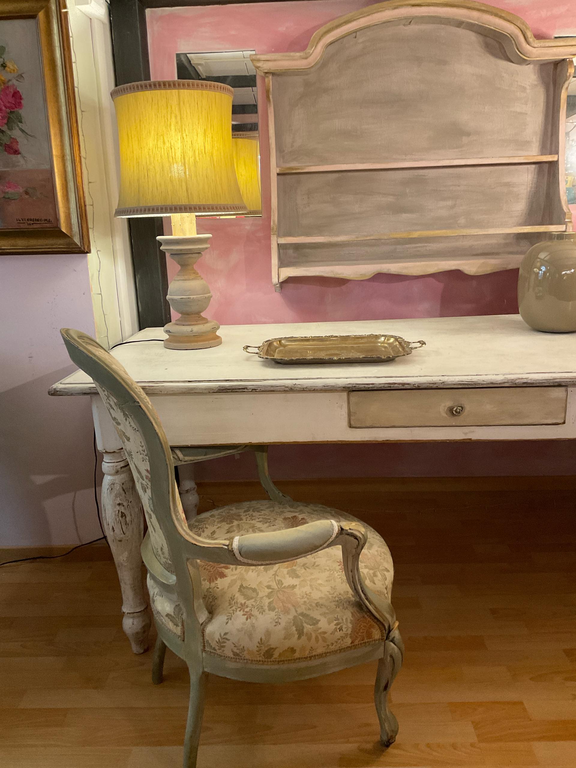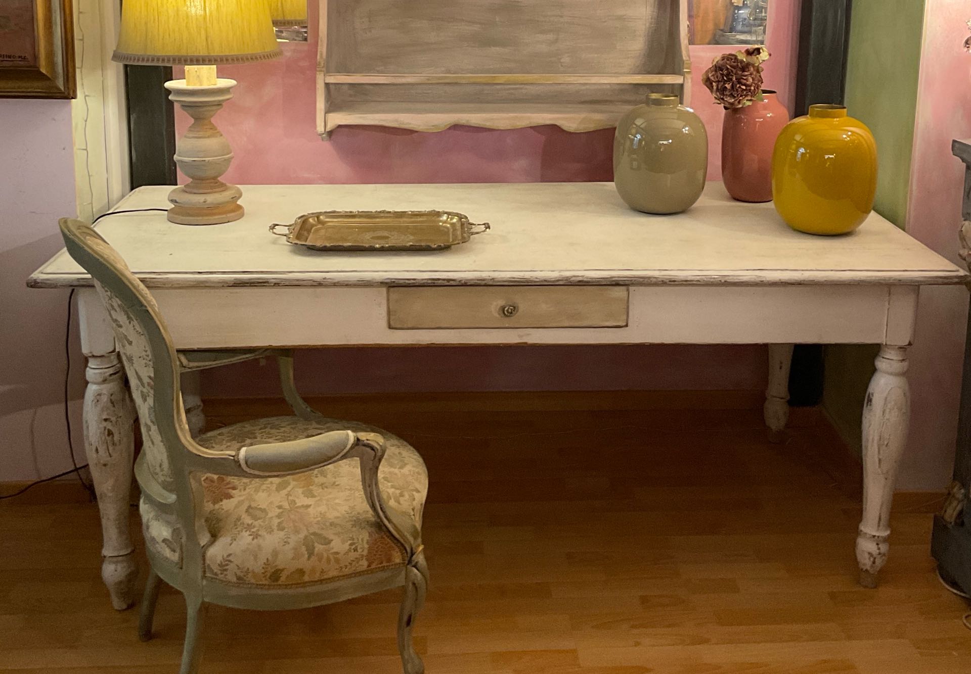 Antico e magnifico tavolo da lavoro risalente alla seconda metà dell’800 con gambe tornite, patina color burro con cassetto centrale beige tortora.