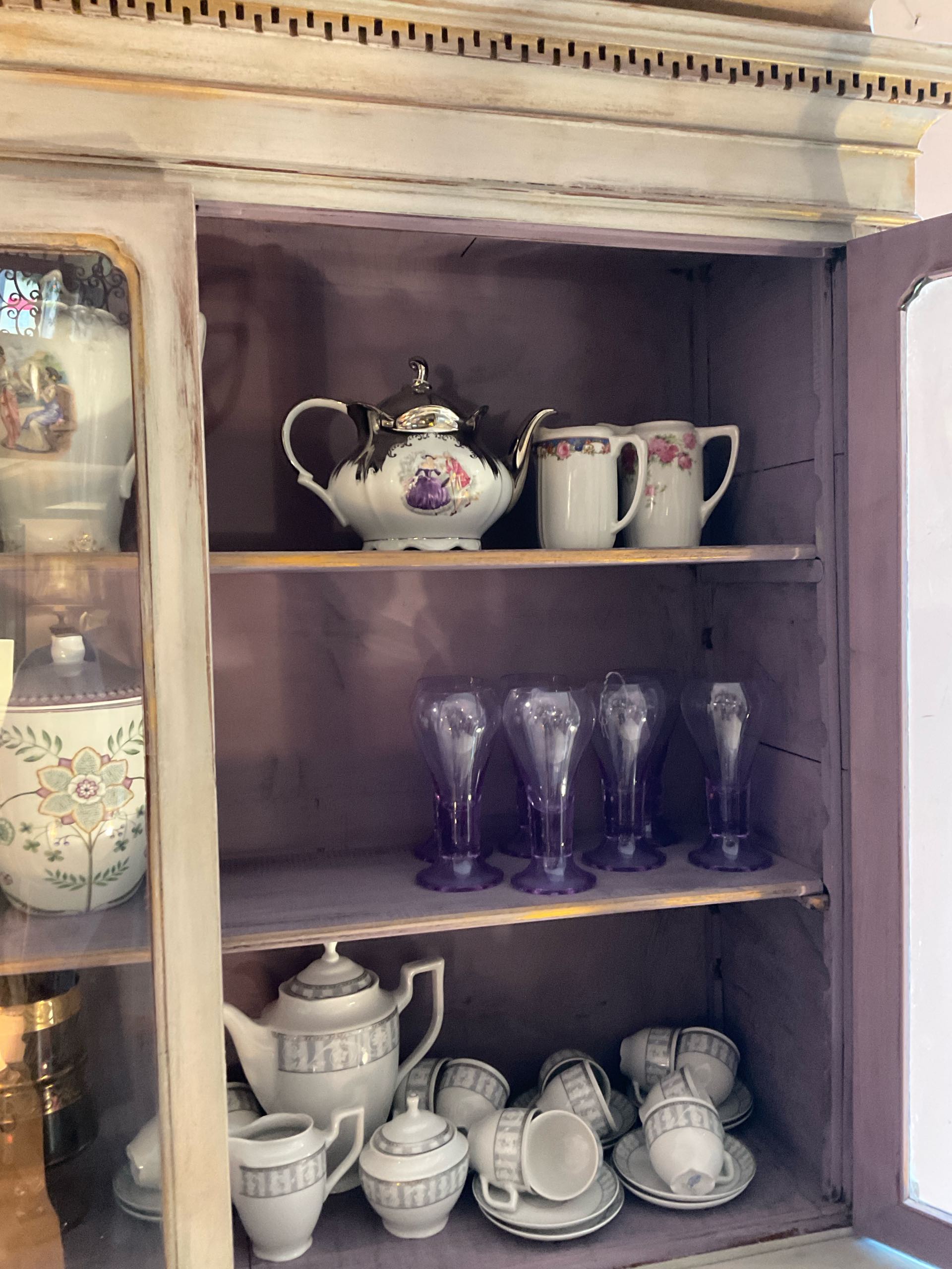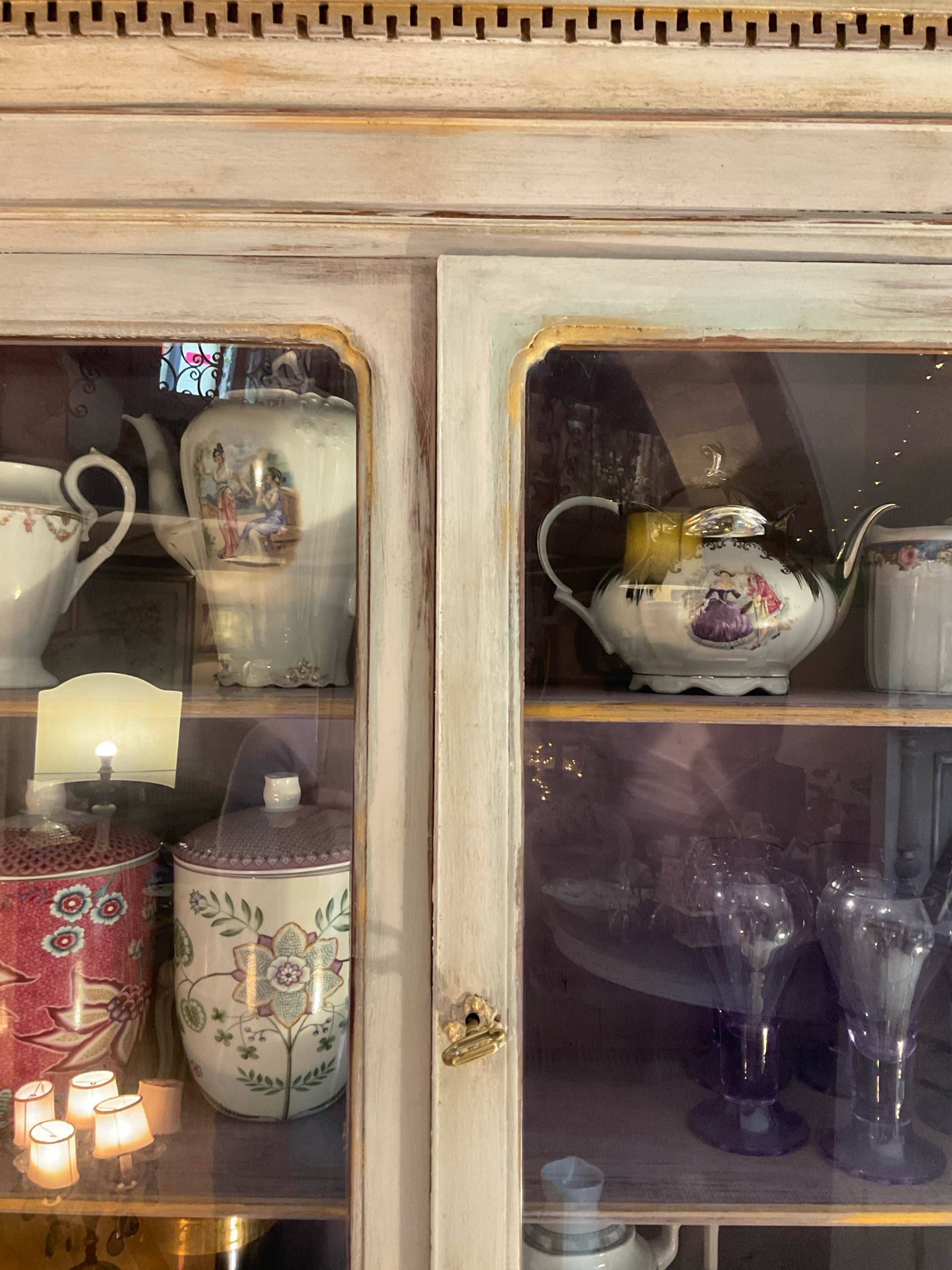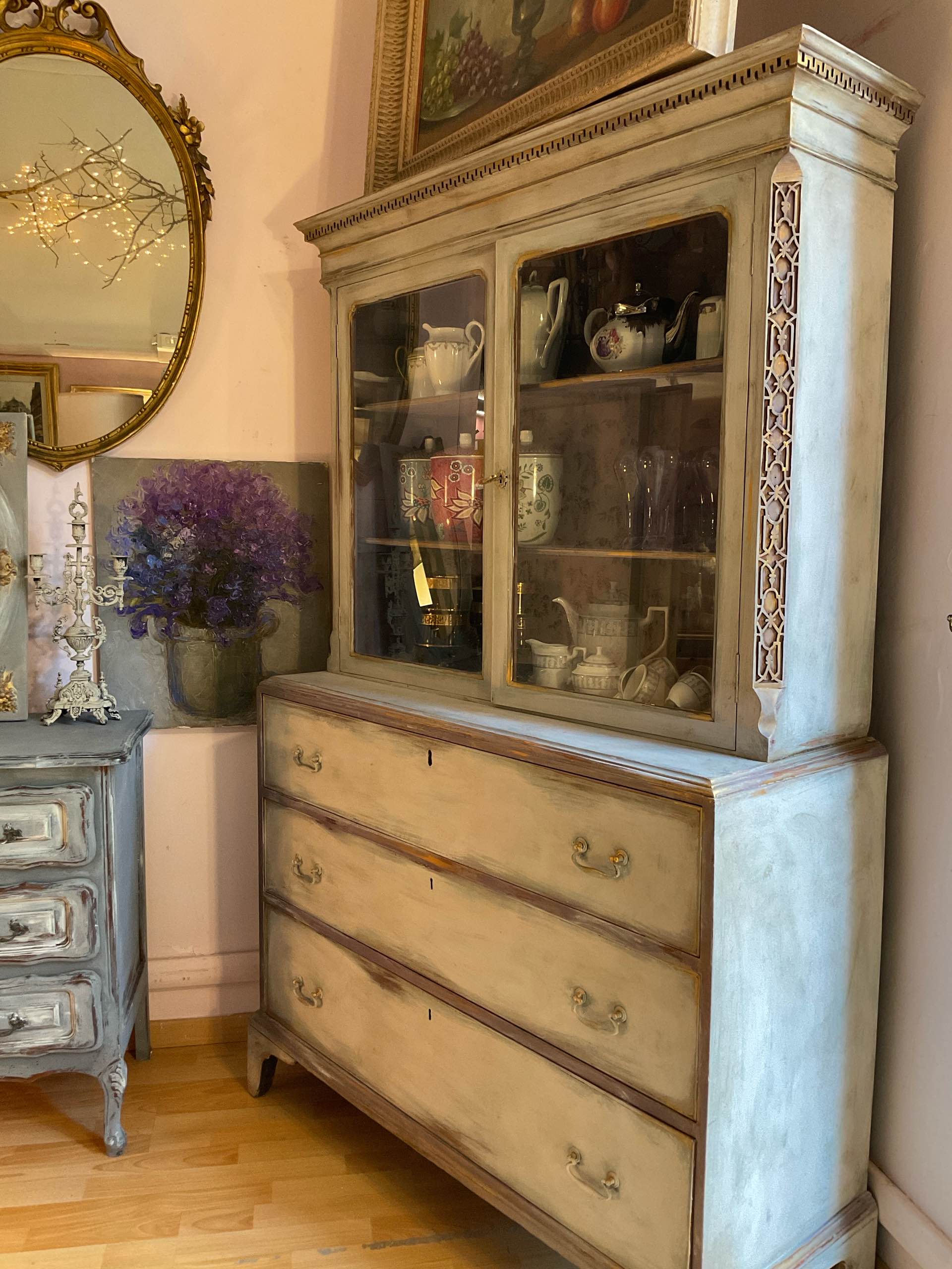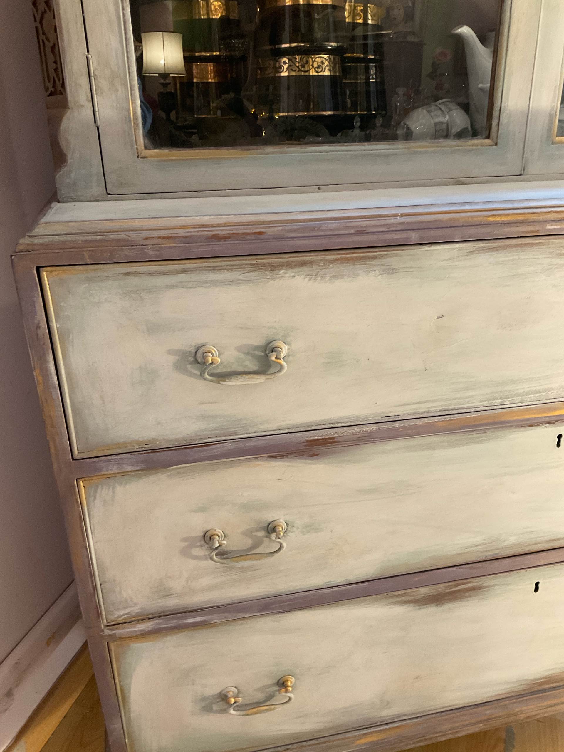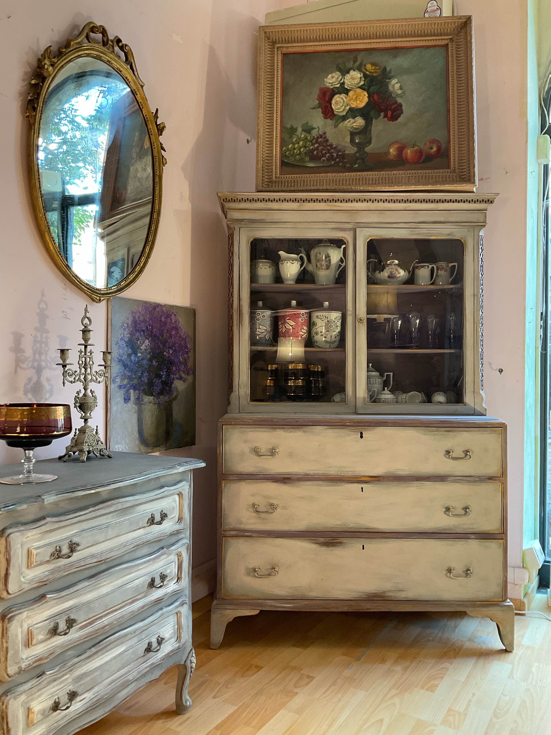 Vetrina inglese risalente al XIX secolo con patina grigio/glicine e qualche tocco di oro.